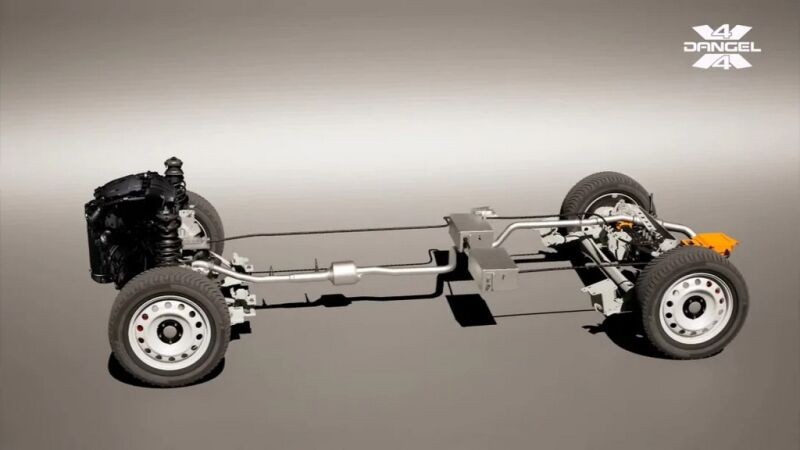 Нова система повного приводу кардинально відрізняється від інших розробок Dangel, адже механічного зв’язку із задніми колесами немає. Натомість там встановлено 48-вольтний електромотор — як у Jeep Avenger 4xe.
