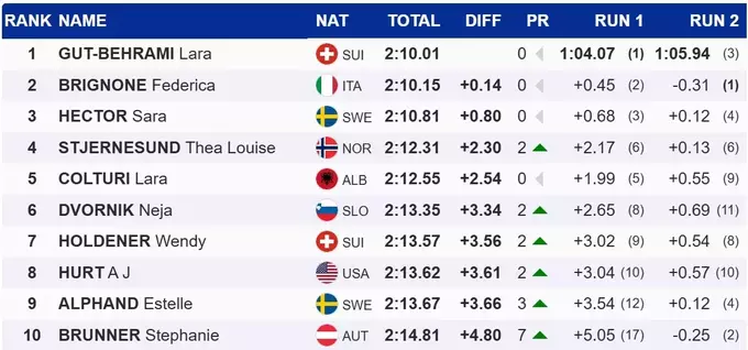 Другою стала Федеріка Бріньоне 25 березня в американському Сан Веллі було проведено гігантський слалом серед жінок на Кубку світу з гірськолижного спорту. Перемогу оформила представниця Швейцарії Лара Гут-Бехрамі, що перед цим тріумфувала в супергіганті на цьому етапі. Спортсменка завершила змагання із загальним часом 2:10.01. Другою фінішувала Федеріка Бріньоне, яка стала володарем Малого кришталевого глобусу в гіганті. Трійку замкнула Сара Хектор зі Швеції. Кубок світу з гірськолижного спорту. 25 березня, Сан Веллі (США) Гігантський слалом, жінки Підсумкова таблиця