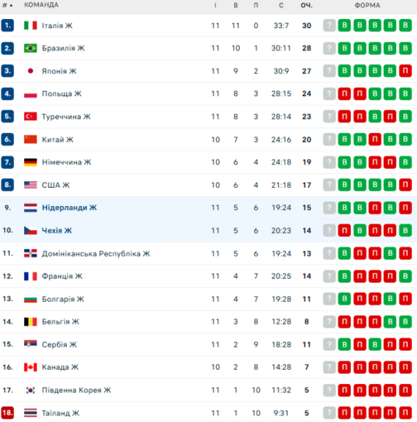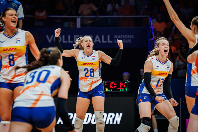 Відбувся черговий матч міжнародного турніру з волейболу Передостанній ігровий день жіночої Ліги націй 2025 приніс нову розв’язку – ще одне місце у фінальному раунді в Лодзі було заброньовано. Завдяки перемозі збірної Нідерландів над Чехією в п’яти партіях (3:2), путівку до плей-оф достроково оформила Німеччина. Лідером нідерландської збірної стала 22-річна діагональна Еллес Дамбрінк, яка набрала 21 очко. Догравальниця Хелена Кок додала 15 очок, а центральна Брітте Стют – ще 10. У складі Чехії найрезультативнішою стала 20-річна діагональна Моніка Бранчуська – 19 очок. Також більше десяти балів набрали капітанка Міхайла Млейнкова (16), догравальниця Магдалена Буковська (14) та блокуюча Магдалена Єгларова (10, зокрема 5 блоків). Завдяки цій перемозі Нідерланди піднялися на дев’яту позицію у таблиці (5 перемог, 15 очок), випередивши Чехію (5 перемог, 14 очок). США наразі замикають вісімку найкращих (6 перемог, 17 очок) і можуть гарантувати собі місце у фіналі, якщо здобудуть хоча б два очки в останніх двох матчах. Ліга націй. 3-й тиждень, 12 липня. Апелдорн (Нідерланди). Чехія – Нідерланди – 2:3 (23:25, 25:23, 25:14, 19:25, 10:15) Турнірна таблиця: