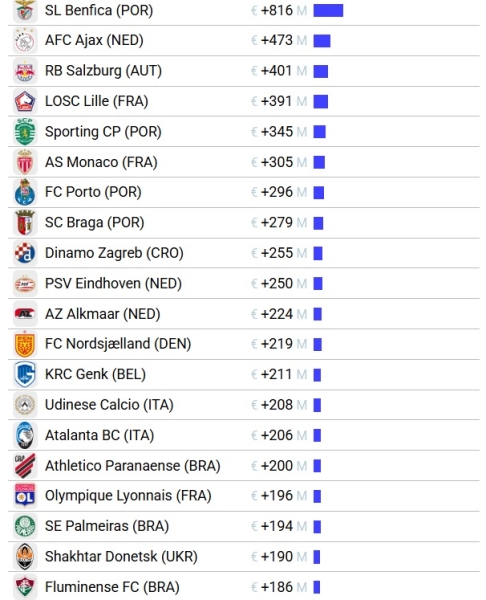 Найуспішнішою у цьому напрямі стала Бенфіка, чий баланс від трансферів за десятиліття становить неймовірні 816 млн. євро. Це майже вдвічі більше, ніж у Аякса, що займає друге місце (473 млн). Третя позиція у Зальцбурга – 401 млн євро. Якщо говорити про клуби ТОП-5 чемпіонатів, то найкращий показник у Лілля – +391 млн. євро та загальне четверте місце. Серед неєвропейських клубів поза конкуренцією Атлетіко Паранаєнсе –+ 200 млн.