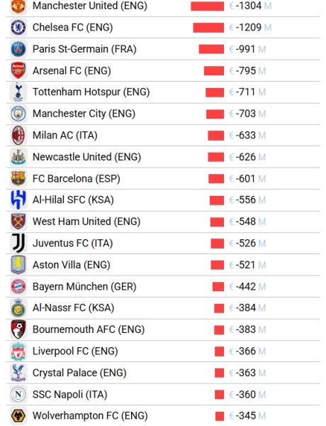 Щодо підсумків трансферної діяльності, то найнегативніший баланс за останнє десятиліття у Манчестер Юнайтед (-1,304 млрд. євро). На другому місці – Челсі (-1,209 млрд. євро), на третьому – ПСЖ (-991 млн. євро). У ТОП-20 найгірших клубів світу за цим показником потрапили 14 англійських, а Реал посідає лише 25-е місце з показником -304 млн євро.