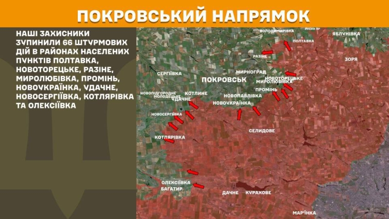 На Покровському напрямку наші захисники зупинили 66 штурмових дій в районах населених пунктів Полтавка, Новоторецьке, Разіне, Миролюбівка, Промінь, Новоукраїнка, Удачне, Новосергіївка, Котлярівка та Олексіївка.