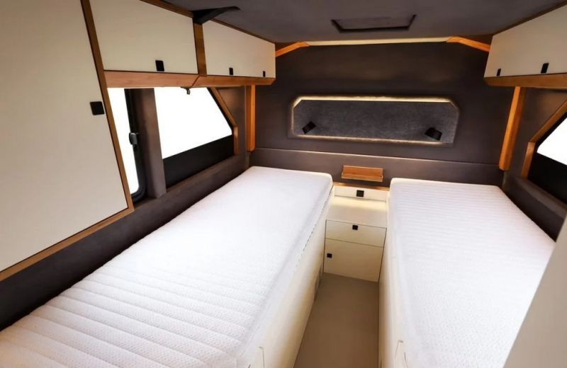 У салоні передбачено спальне місце, мінікухню з варильною поверхнею, холодильником, зоною для обіду, санвузол та достатню кількість шаф для зберігання. З технічного оснащення є кондиціонер, бойлер, телевізор, аудіосистема та сонячні панелі.