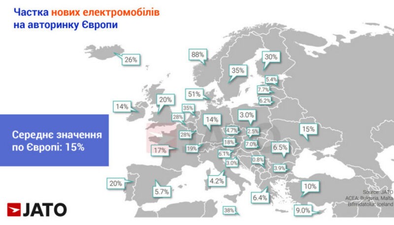Лідером по частці електричних авто залишається Норвегія (88%), за нею йдуть Данія (51%), Швеція (35%) та Нідерланди (34,7%). Німеччина, навпаки, демонструє спад продажів через відсутність ясності щодо подальшого стимулювання ринку.